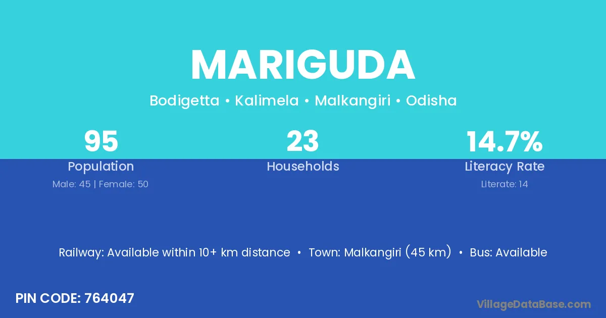 Malkangiri (45 km) is the nearest town to Mariguda village for major economic activities and is located approximately 45 km away.