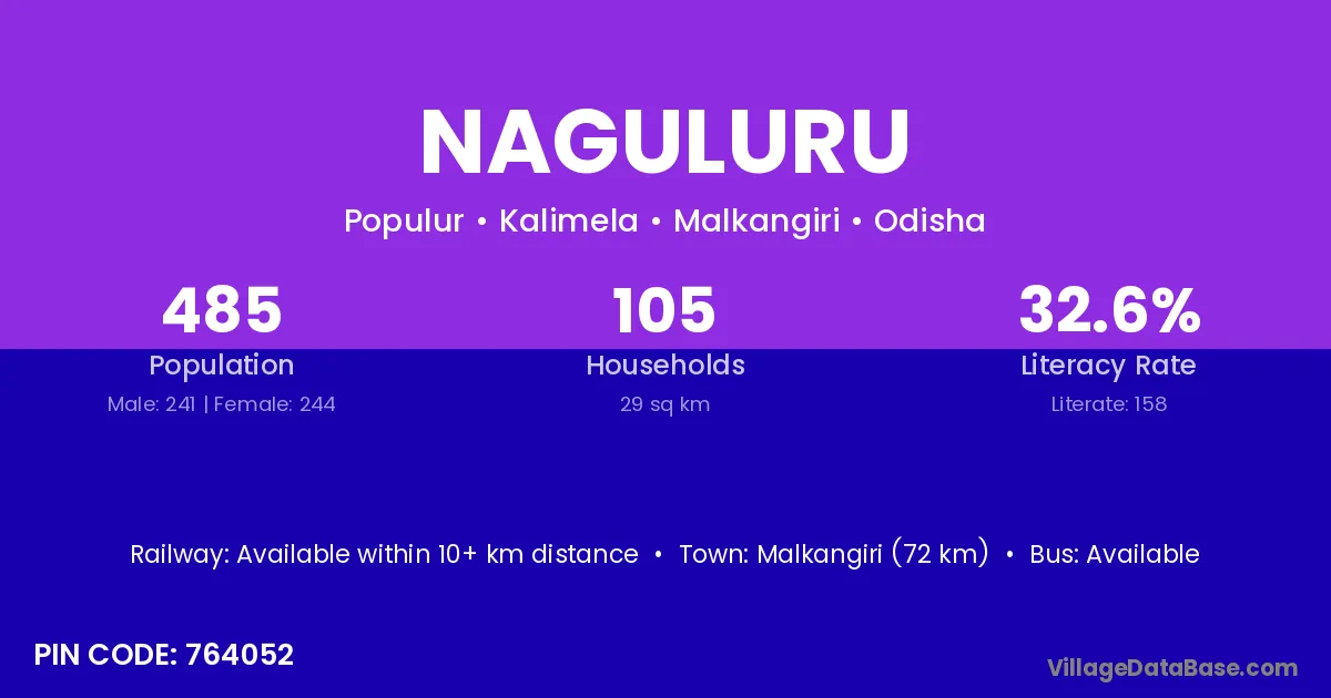 Malkangiri (72 km) is the nearest town to Naguluru village for major economic activities and is located approximately 72 km away.