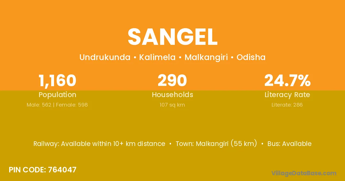 Malkangiri (55 km) is the nearest town to Sangel village for major economic activities and is located approximately 55 km away.