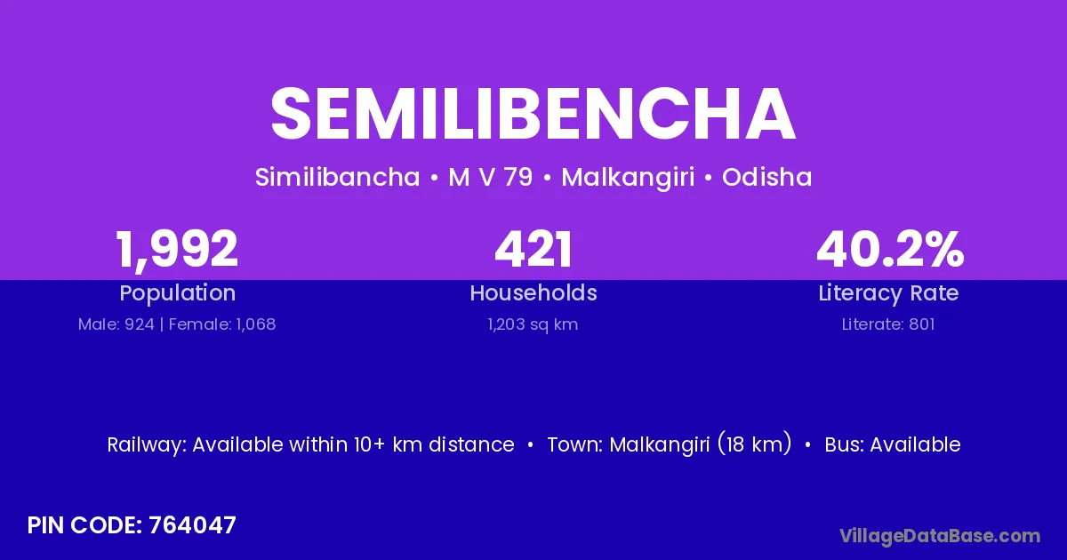 Malkangiri (18 km) is the nearest town to Semilibencha village for major economic activities and is located approximately 18 km away.