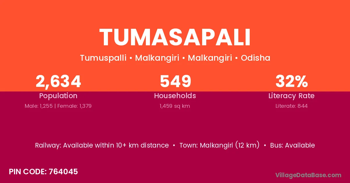 Malkangiri (12 km) is the nearest town to Tumasapali village for major economic activities and is located approximately 12 km away.