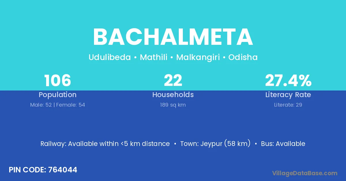 Jeypur (58 km) is the nearest town to Bachalmeta village for major economic activities and is located approximately 58 km away.