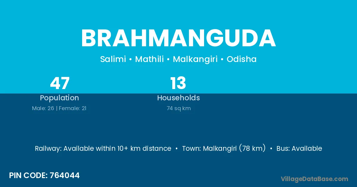 Malkangiri (78 km) is the nearest town to Brahmanguda village for major economic activities and is located approximately 78 km away.