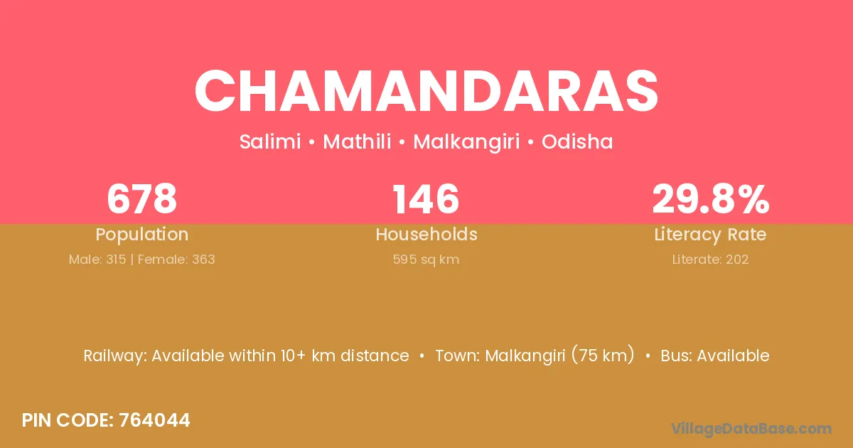 Malkangiri (75 km) is the nearest town to Chamandaras village for major economic activities and is located approximately 75 km away.