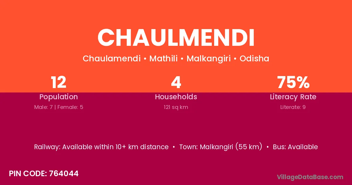 Malkangiri (55 km) is the nearest town to Chaulmendi village for major economic activities and is located approximately 55 km away.