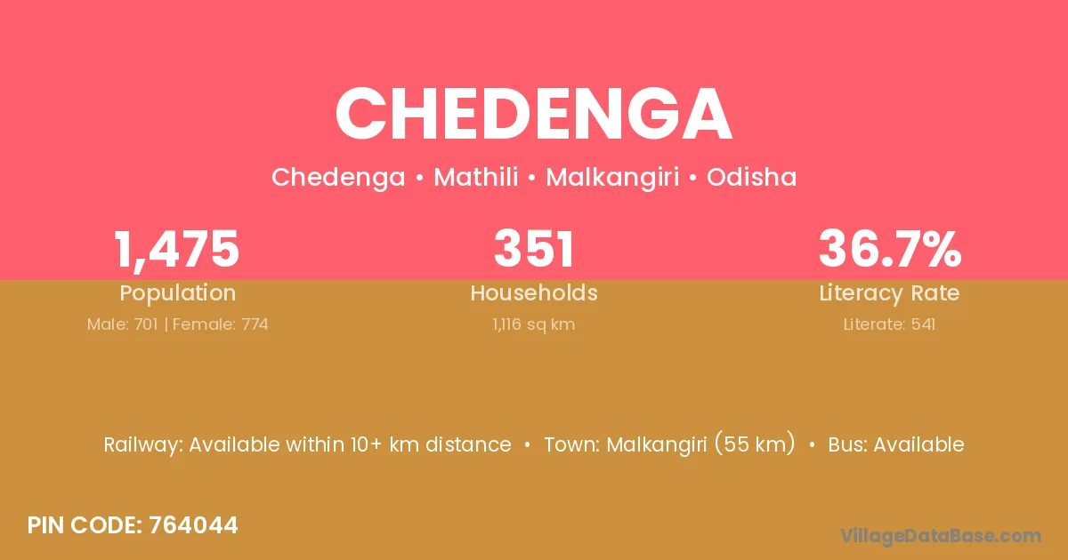 Malkangiri (55 km) is the nearest town to Chedenga village for major economic activities and is located approximately 55 km away.