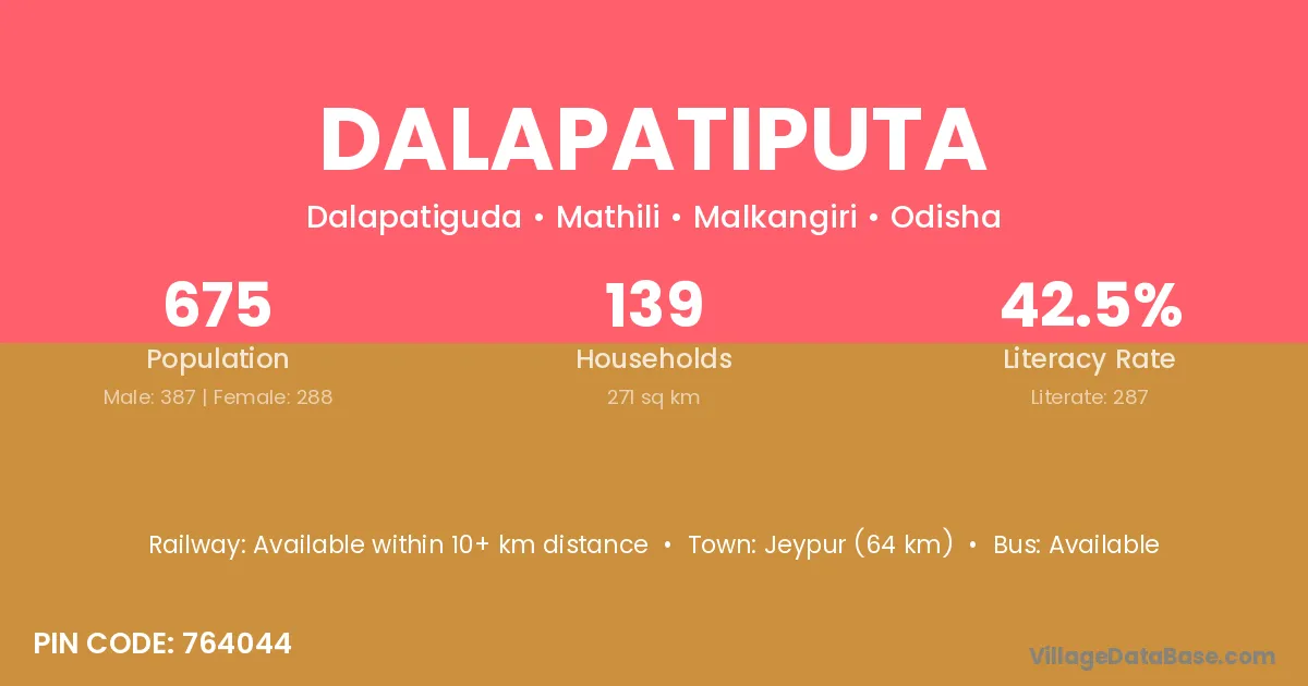 Jeypur (64 km) is the nearest town to Dalapatiputa village for major economic activities and is located approximately 64 km away.