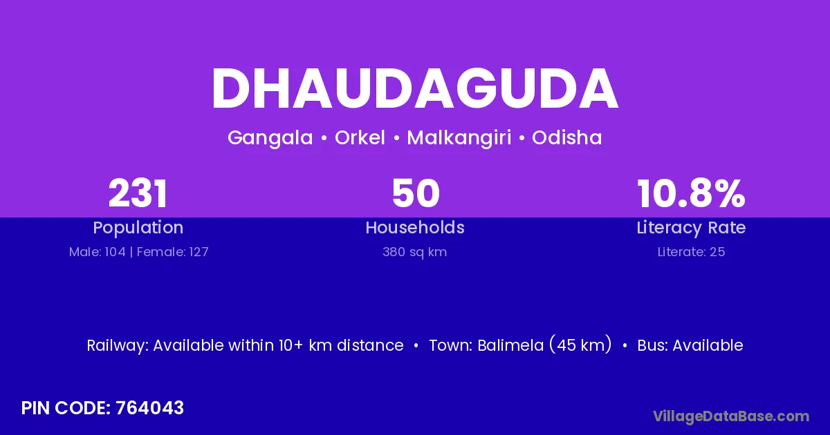 Malkangiri (50 km) is the nearest town to Dhaudaguda village for major economic activities and is located approximately 50 km away.