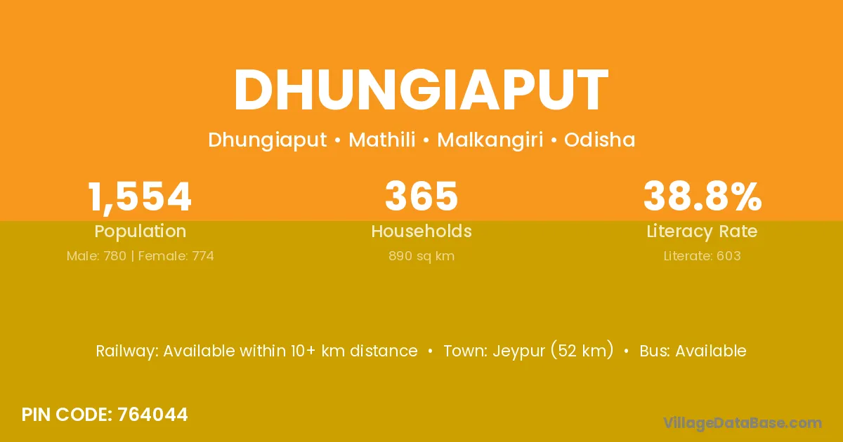 Jeypur (52 km) is the nearest town to Dhungiaput village for major economic activities and is located approximately 52 km away.