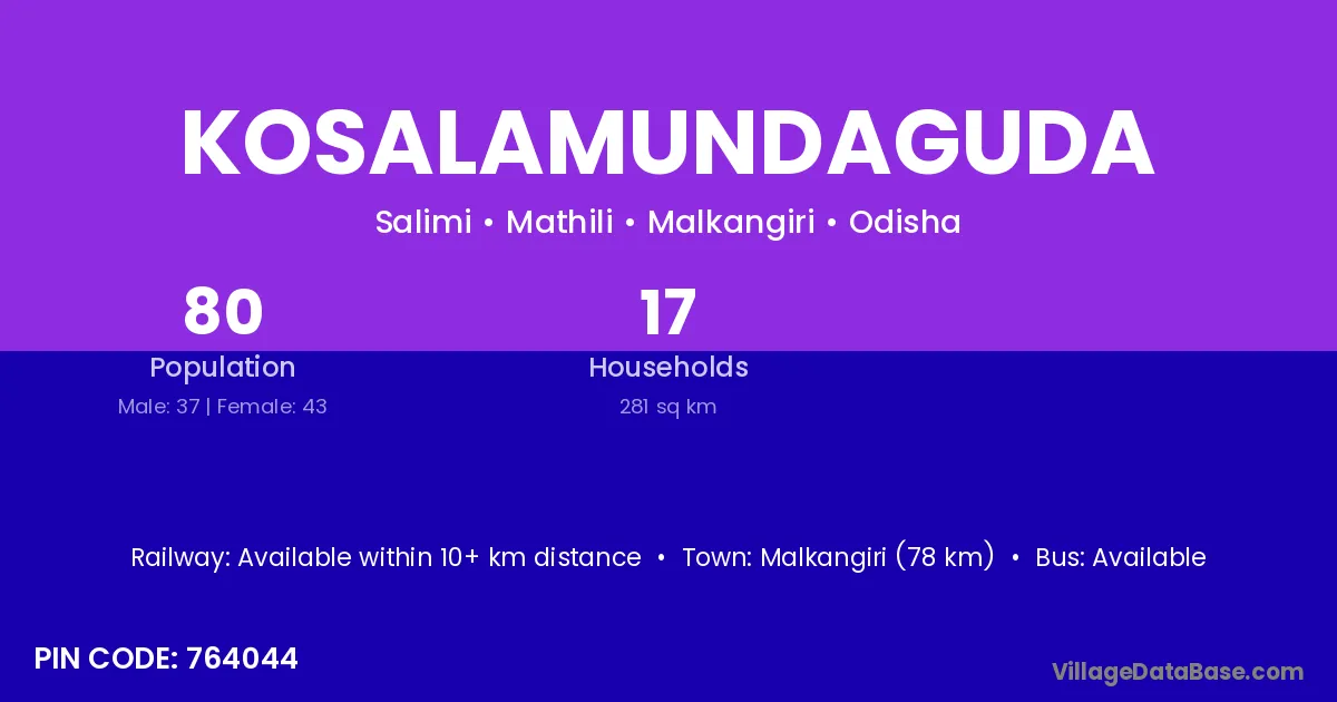 Malkangiri (78 km) is the nearest town to Kosalamundaguda village for major economic activities and is located approximately 78 km away.