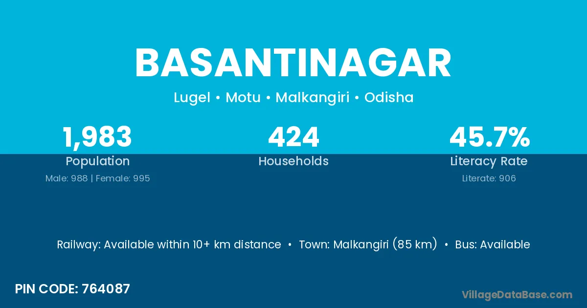Malkangiri (85 km) is the nearest town to Basantinagar village for major economic activities and is located approximately 85 km away.
