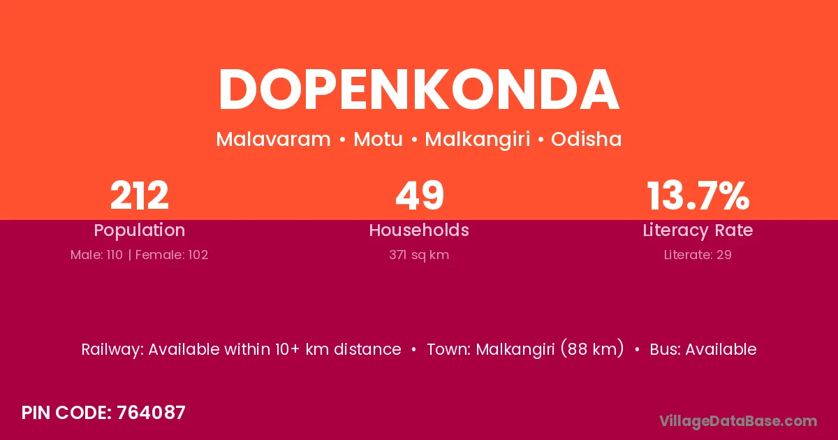 Malkangiri (88 km) is the nearest town to Dopenkonda village for major economic activities and is located approximately 88 km away.