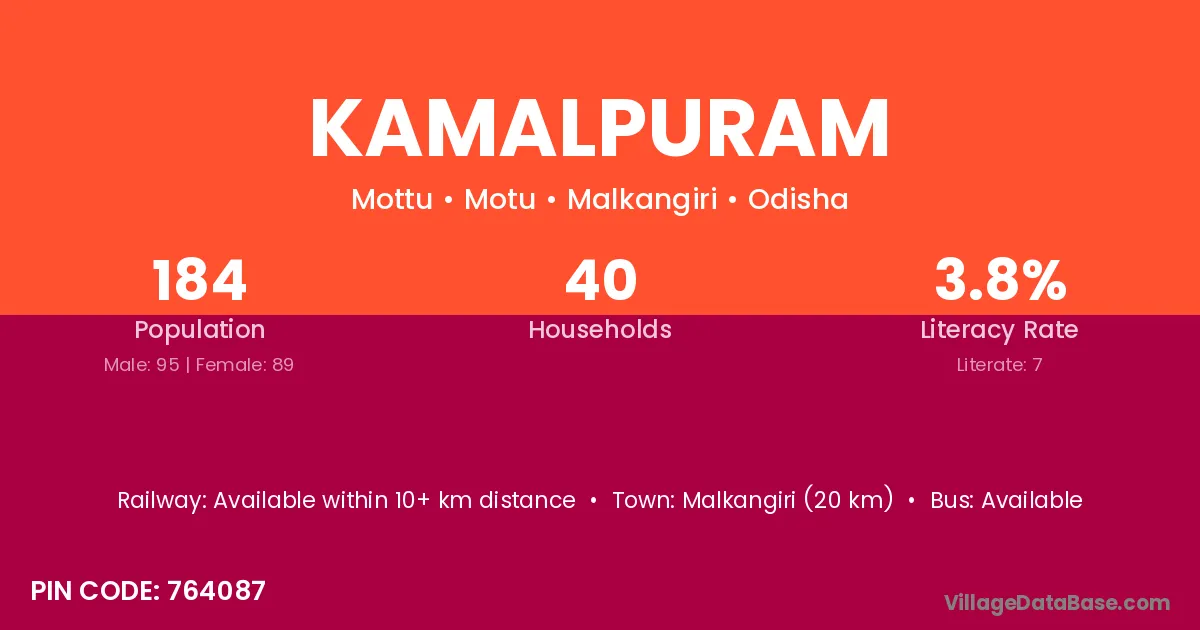 Malkangiri (20 km) is the nearest town to Kamalpuram village for major economic activities and is located approximately 20 km away.