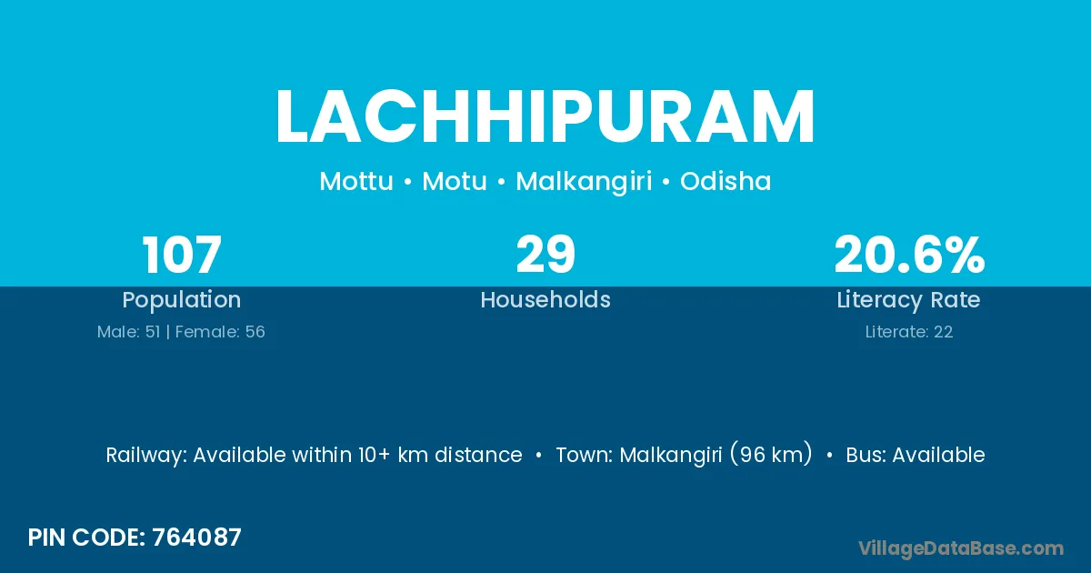 Malkangiri (96 km) is the nearest town to Lachhipuram village for major economic activities and is located approximately 96 km away.