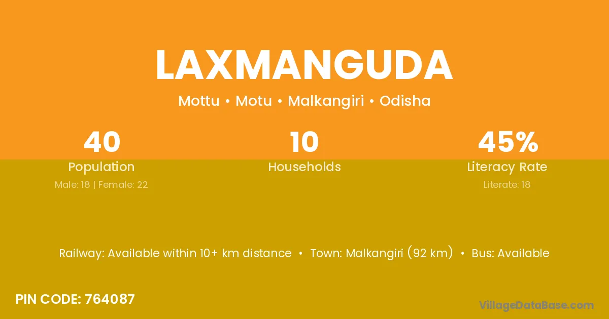 Laxmanguda village has a total population of 40 people, of which 18 are males and 22 are females.