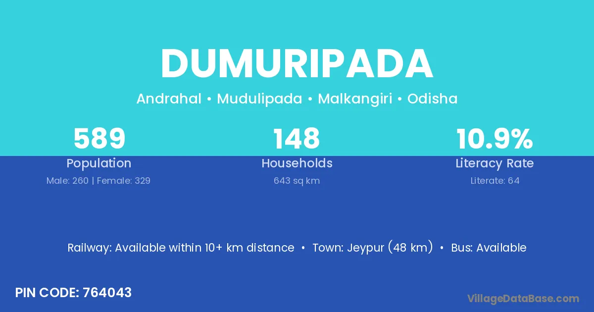 Jeypur (48 km) is the nearest town to Dumuripada village for major economic activities and is located approximately 48 km away.