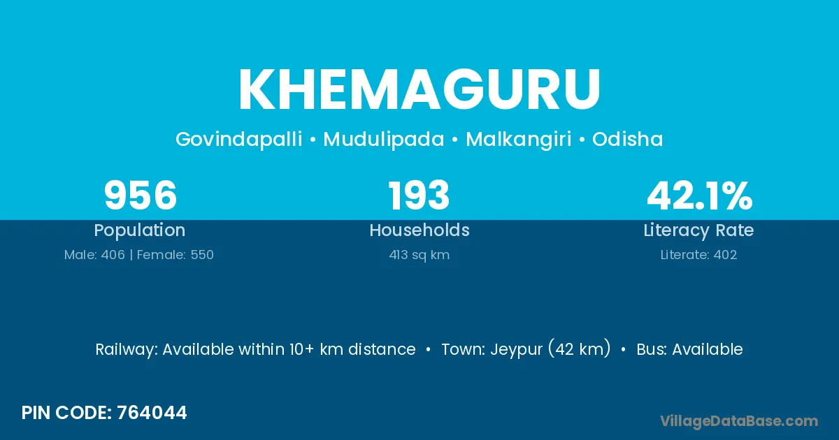 Jeypur (42 km) is the nearest town to Khemaguru village for major economic activities and is located approximately 42 km away.