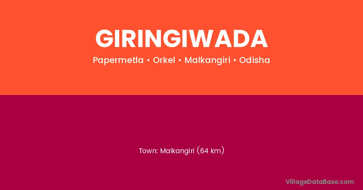 Malkangiri (64 km) is the nearest town to Giringiwada village for major economic activities and is located approximately 64 km away.