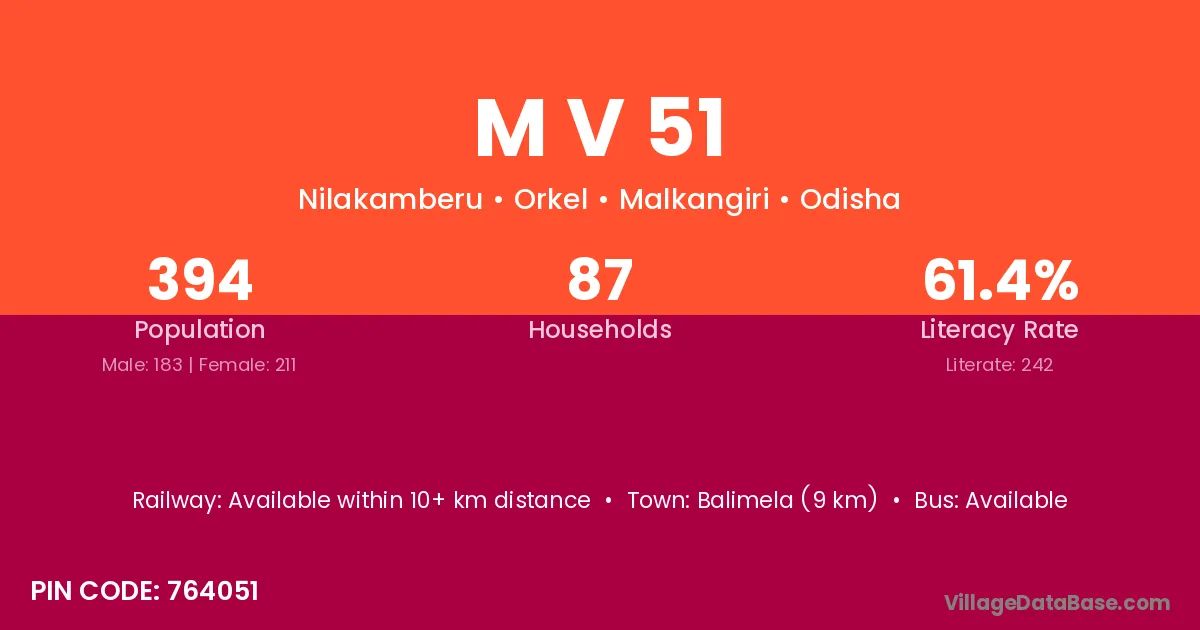 Balimela (9 km) is the nearest town to M V 51 village for major economic activities and is located approximately 9 km away.