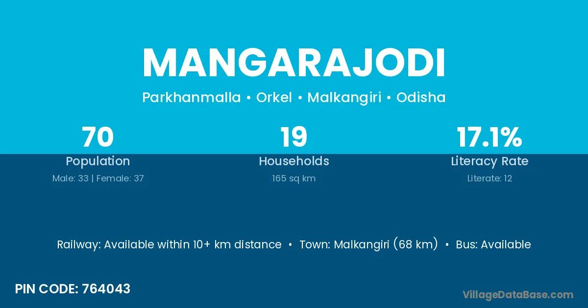 Malkangiri (68 km) is the nearest town to Mangarajodi village for major economic activities and is located approximately 68 km away.