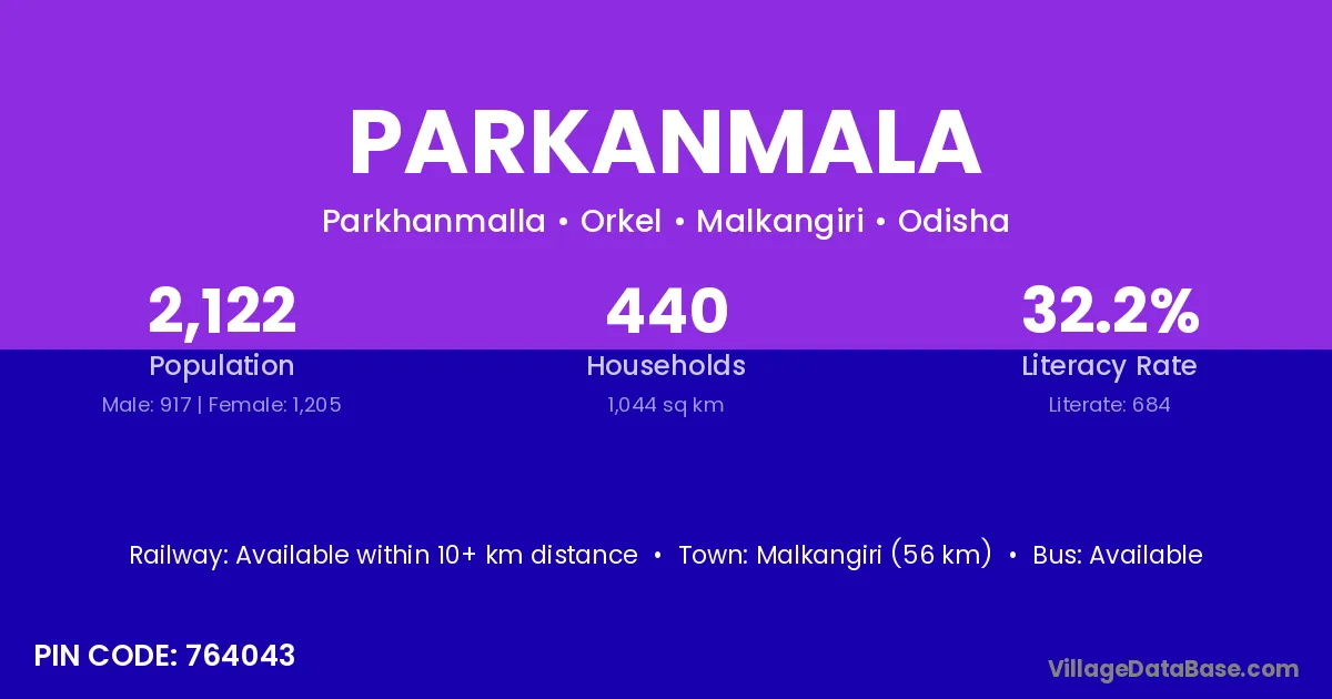 Malkangiri (56 km) is the nearest town to Parkanmala village for major economic activities and is located approximately 56 km away.