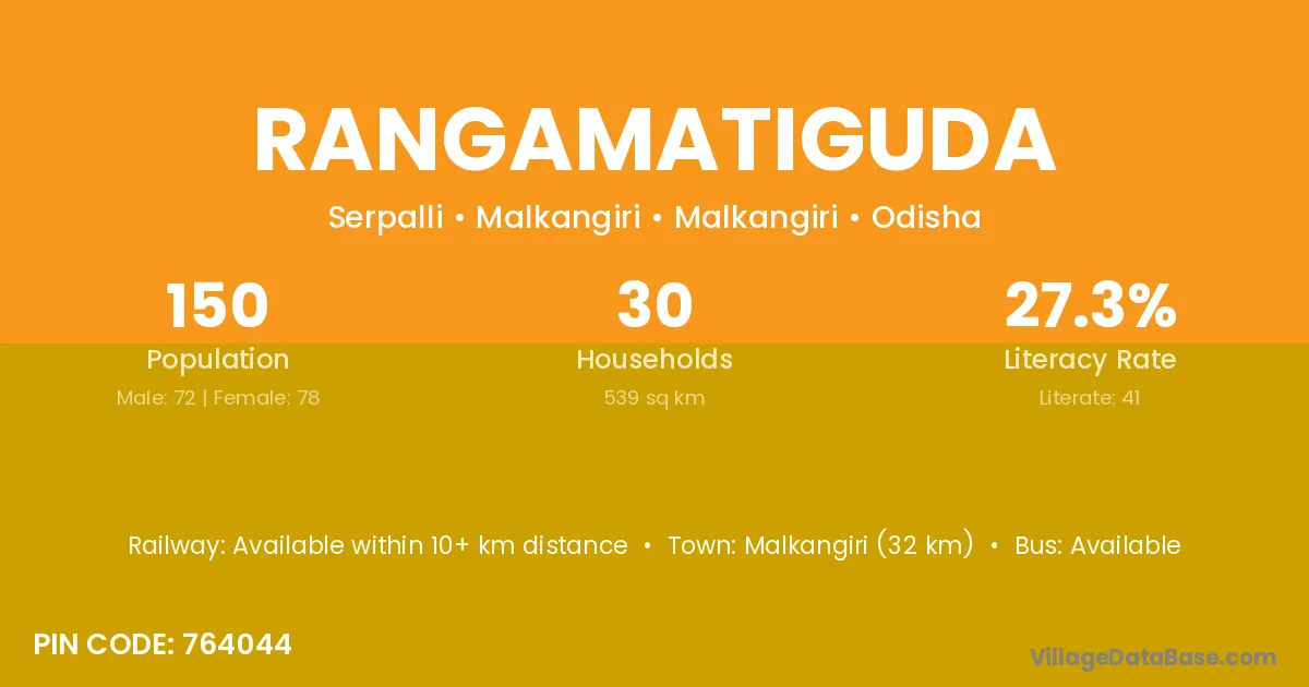According to Census 2011 information, the village code of Rangamatiguda village is 764051.