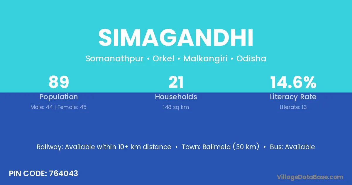 Balimela (30 km) is the nearest town to Simagandhi village for major economic activities and is located approximately 30 km away.