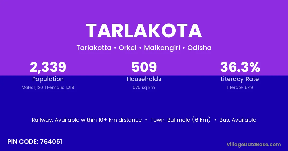 Balimela (6 km) is the nearest town to Tarlakota village for major economic activities and is located approximately 6 km away.