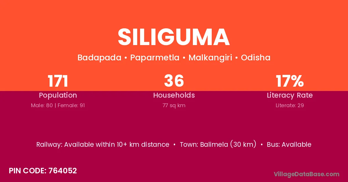 Balimela (30 km) is the nearest town to Siliguma village for major economic activities and is located approximately 30 km away.