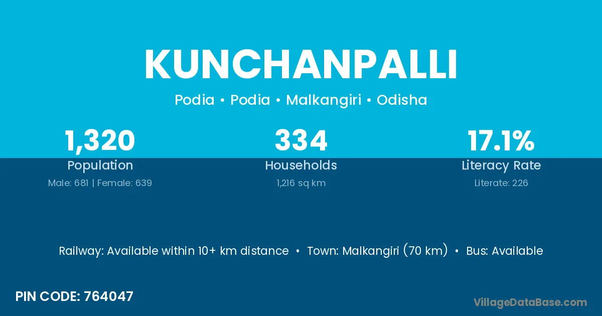 Malkangiri (70 km) is the nearest town to Kunchanpalli village for major economic activities and is located approximately 70 km away.