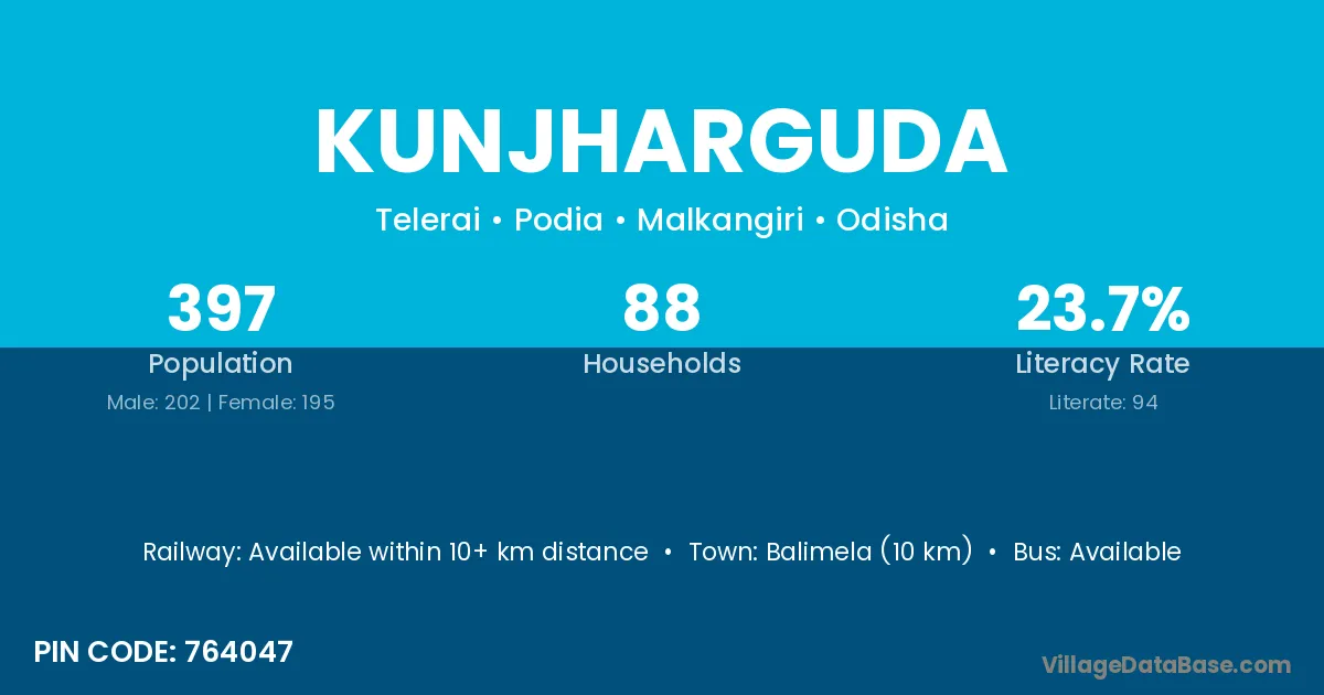 Balimela (10 km) is the nearest town to Kunjharguda village for major economic activities and is located approximately 10 km away.