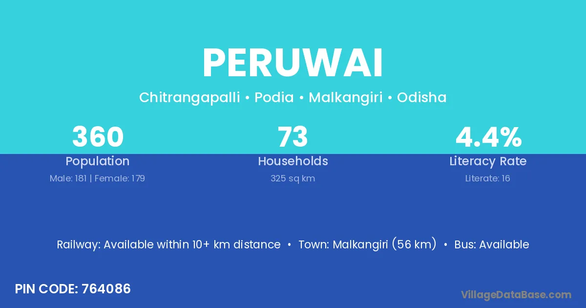 Malkangiri (56 km) is the nearest town to Peruwai village for major economic activities and is located approximately 56 km away.