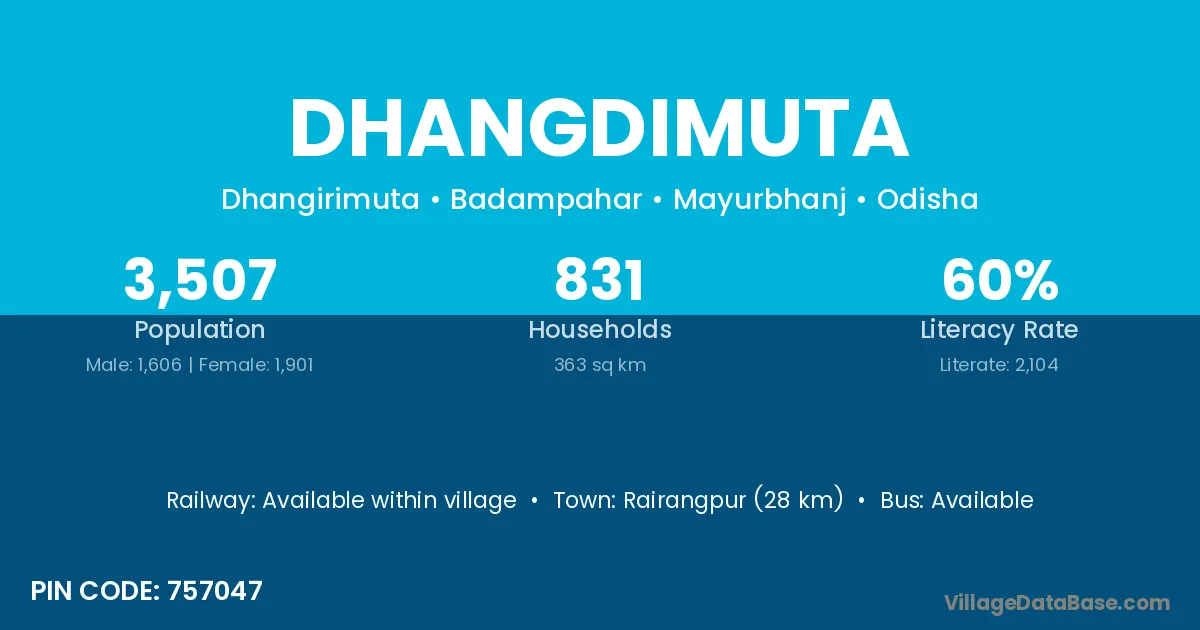 Rairangpur (28 km) is the nearest town to Dhangdimuta village for major economic activities and is located approximately 28 km away.