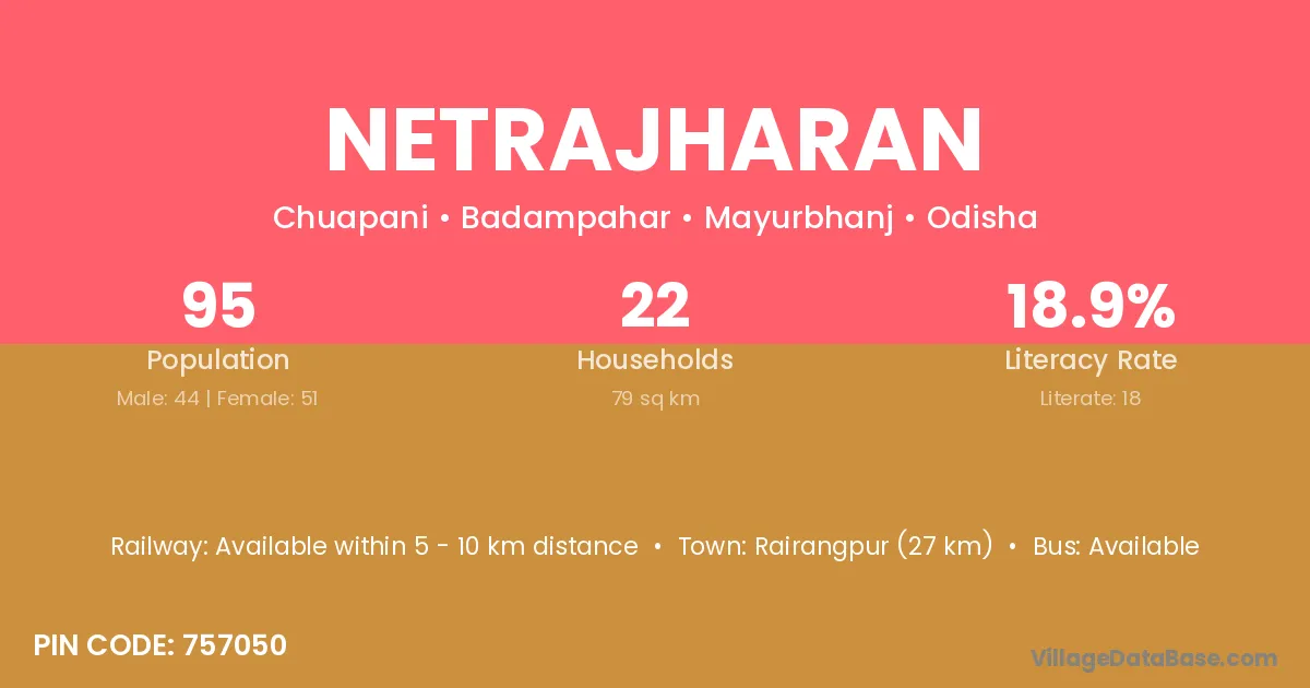Rairangpur (27 km) is the nearest town to Netrajharan village for major economic activities and is located approximately 27 km away.