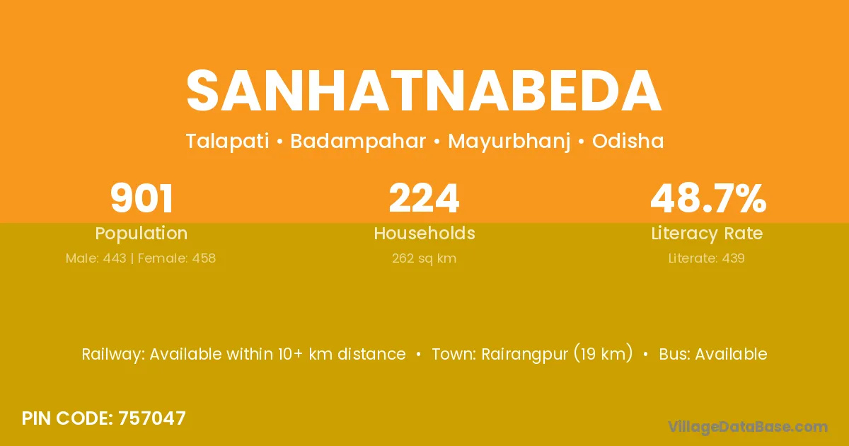 Rairangpur (19 km) is the nearest town to Sanhatnabeda village for major economic activities and is located approximately 19 km away.