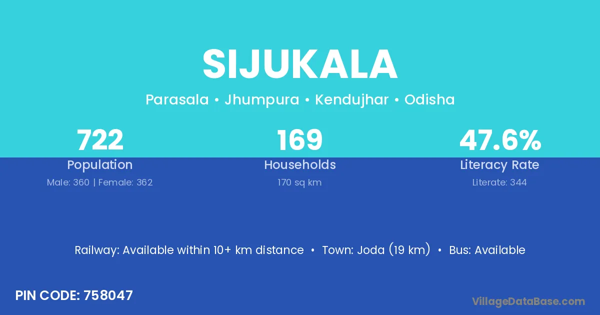 Rairangpur (10 km) is the nearest town to Sijukala village for major economic activities and is located approximately 10 km away.