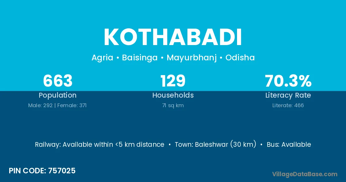 Baleshwar (30 km) is the nearest town to Kothabadi village for major economic activities and is located approximately 30 km away.