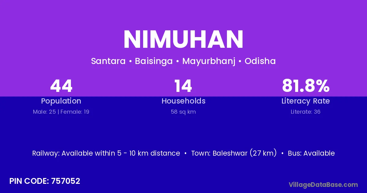 Baleshwar (27 km) is the nearest town to Nimuhan village for major economic activities and is located approximately 27 km away.