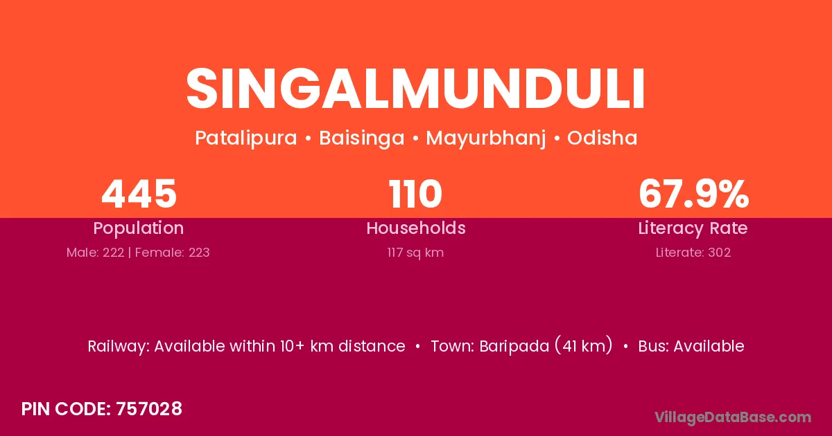 Baripada (41 km) is the nearest town to Singalmunduli village for major economic activities and is located approximately 41 km away.