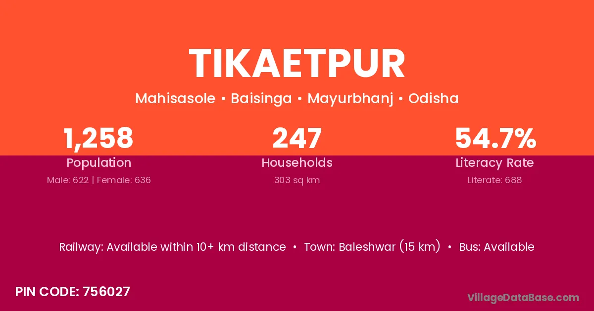 Baleshwar (15 km) is the nearest town to Tikaetpur village for major economic activities and is located approximately 15 km away.