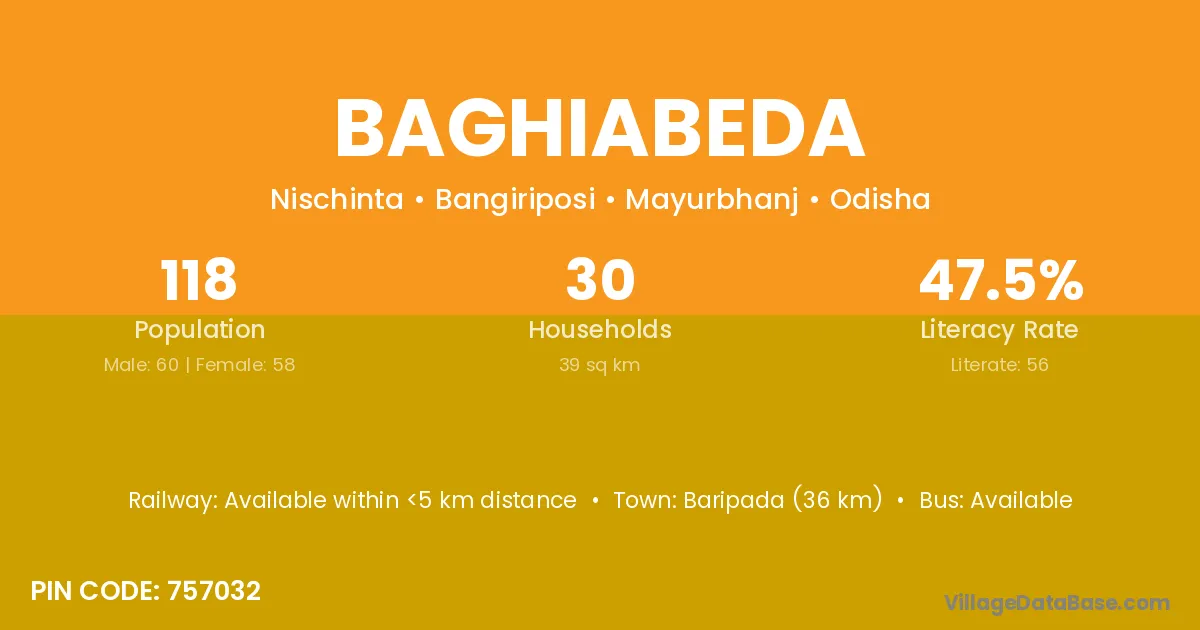 Baripada (36 km) is the nearest town to Baghiabeda village for major economic activities and is located approximately 36 km away.