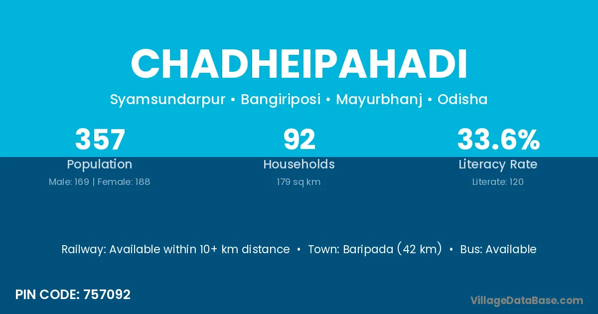 Baripada (42 km) is the nearest town to Chadheipahadi village for major economic activities and is located approximately 42 km away.