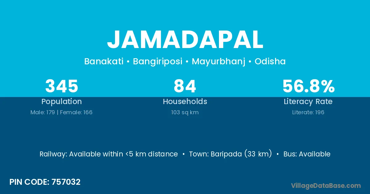 Baripada (33 km) is the nearest town to Jamadapal village for major economic activities and is located approximately 33 km away.