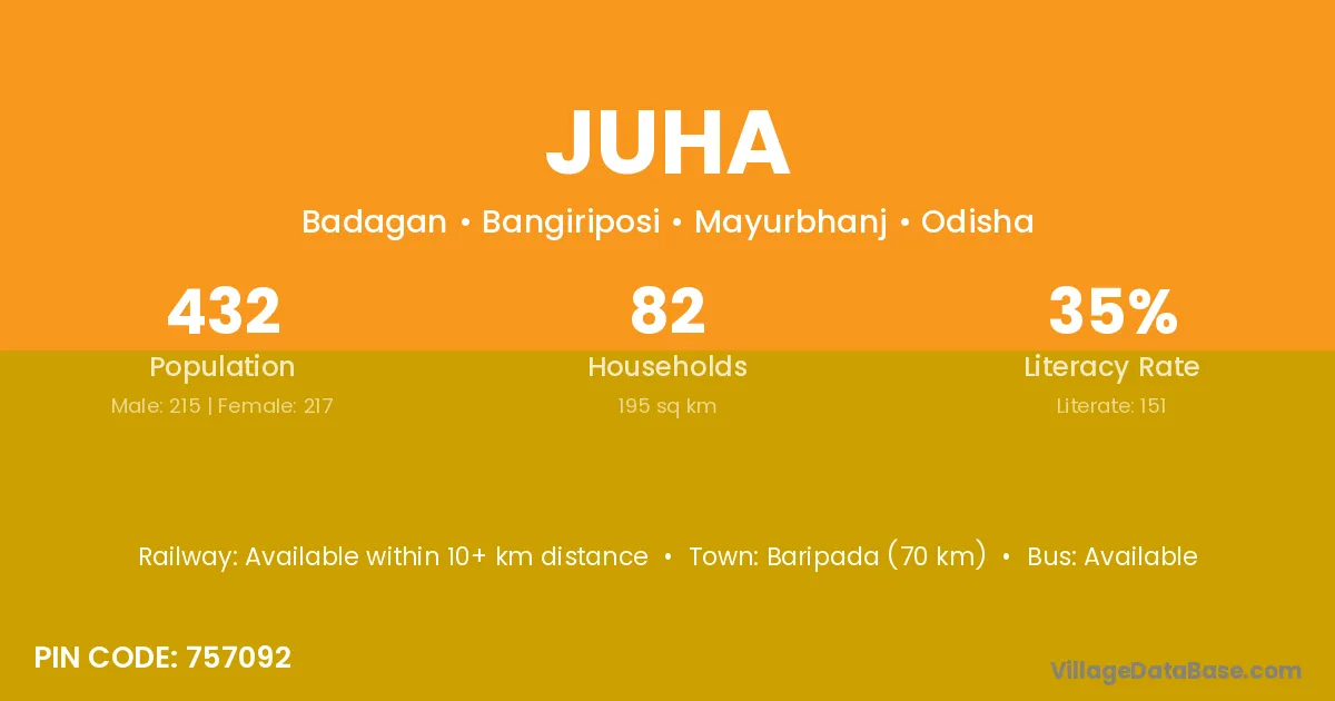 Baripada (70 km) is the nearest town to Juha village for major economic activities and is located approximately 70 km away.