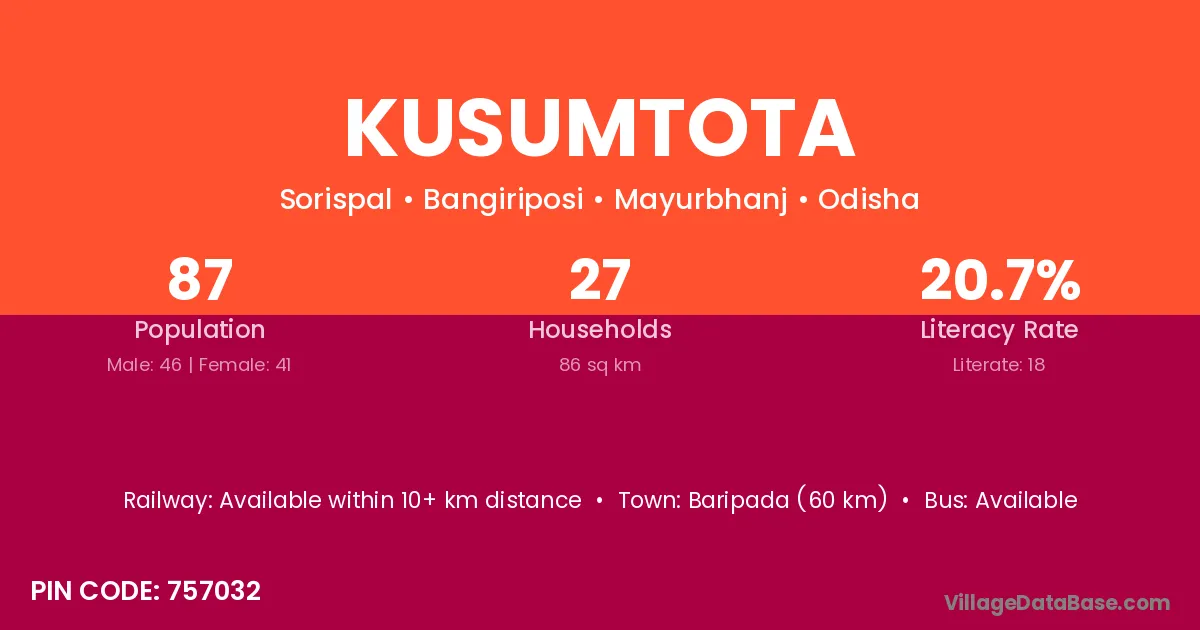 Baripada (60 km) is the nearest town to Kusumtota village for major economic activities and is located approximately 60 km away.