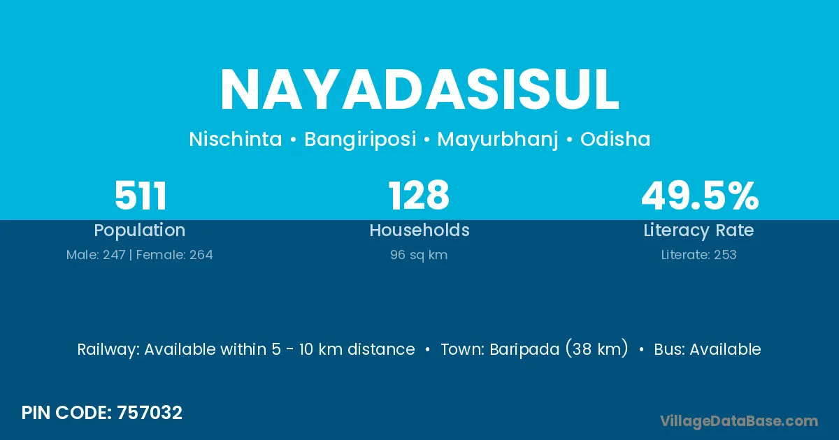 Baripada (38 km) is the nearest town to Nayadasisul village for major economic activities and is located approximately 38 km away.