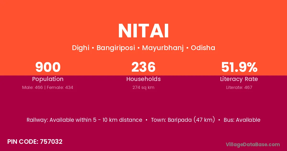 Baripada (47 km) is the nearest town to Nitai village for major economic activities and is located approximately 47 km away.