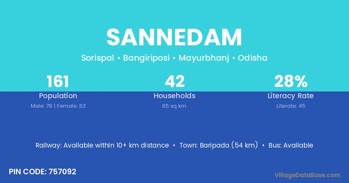 Baripada (54 km) is the nearest town to Sannedam village for major economic activities and is located approximately 54 km away.