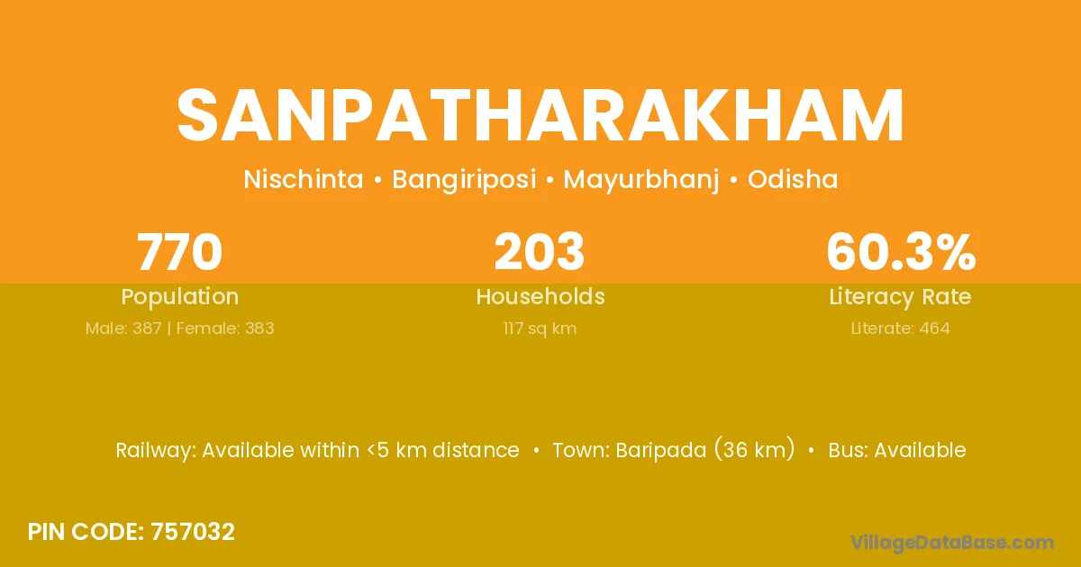 Baripada (36 km) is the nearest town to Sanpatharakham village for major economic activities and is located approximately 36 km away.