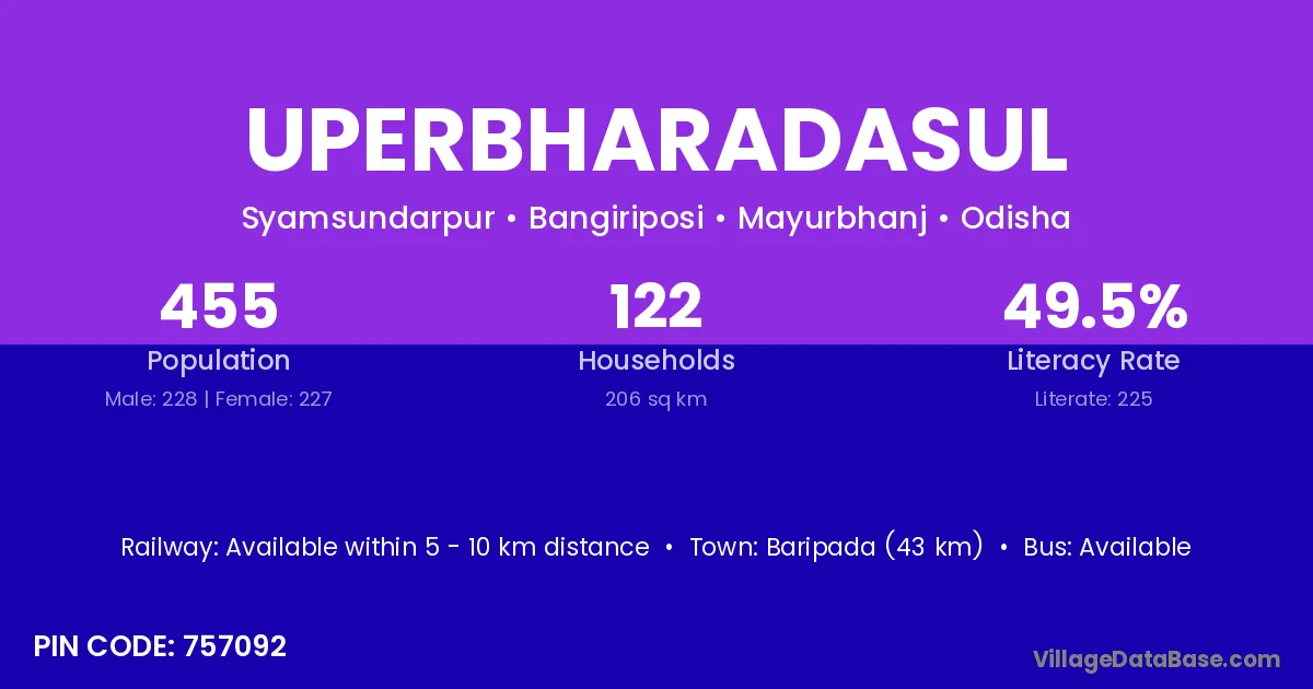 Baripada (43 km) is the nearest town to Uperbharadasul village for major economic activities and is located approximately 43 km away.